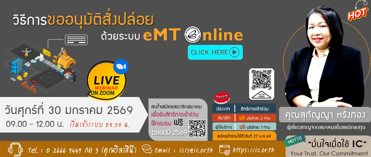 หลักสูตรเบื้องต้นสำหรับผู้เริ่มปฏิบัติงานด้านการส่งเสริมการลงทุน ระบบงานสิทธิประโยชน์ด้านเครื่องจักร  ผู้ไม่มีพื้นฐานระบบงานสิทธิประโยชน์ด้านเครื่องจักรและการยื่นคำร้องผ่านระบบ eMT กับสมาคม